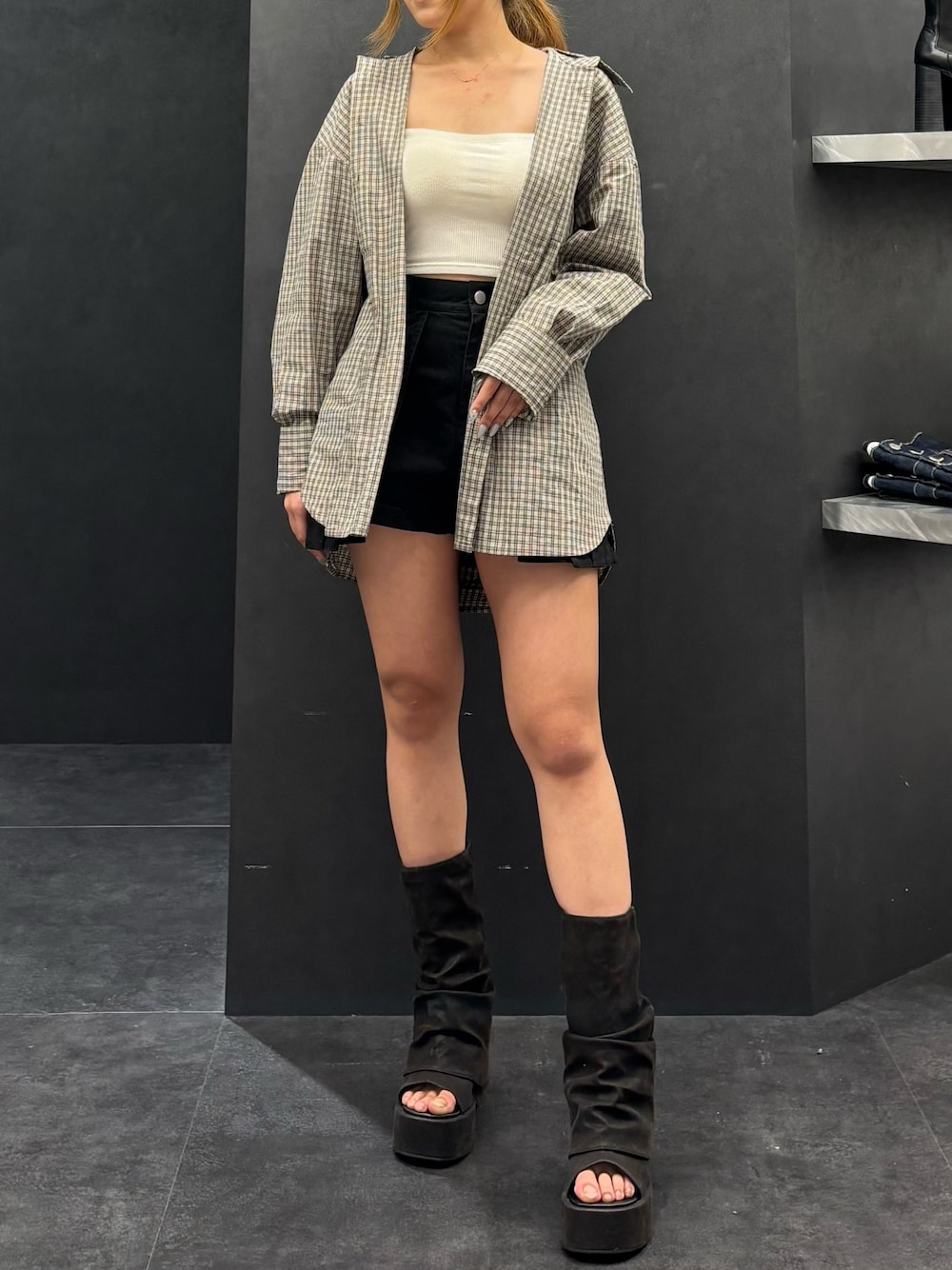 【トップス】フードが取り外し可能なチェックシャツ👔このオーバーサイズ感がかわいい💕 【ボトムス】後ろから見たらスカートだけど実はショートパンツで安心😌 【シューズ】ヒール約10cmでミニとの相性が抜群なカバーサンダル👡23.5cmでMサイズ着用