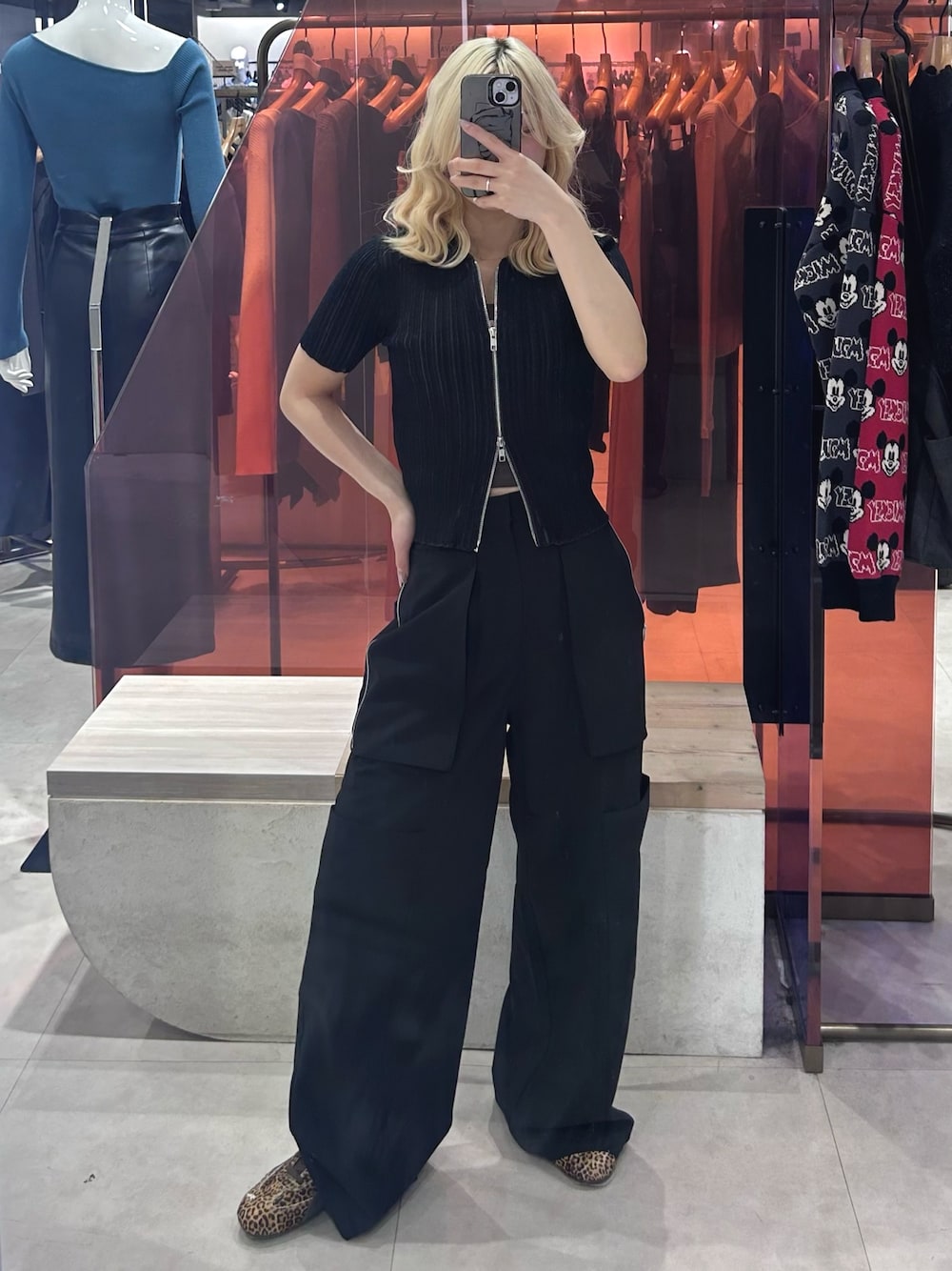 ジップトップスでコンパクトにまとめつつ、ワイドカーゴで抜け感プラス。 足元はレオパードでさりげなくアクセント☆ 【𝐓𝐨𝐩𝐬】 ダブルジップで抜け感を出しつつ、縦リブでスッキリ見え◎ 【𝐁𝐨𝐭𝐭𝐨𝐦𝐬】 ワイドなシルエットのカーゴパンツでラフさと今っぽさをプラス モードにもカジュアルにも決まる1つ持ってると楽なパンツ◎ 【𝐒𝐡𝐨𝐞𝐬】 レオパード柄でシンプルコーデのアクセントに 普段23.5着用で23.5丁度でした