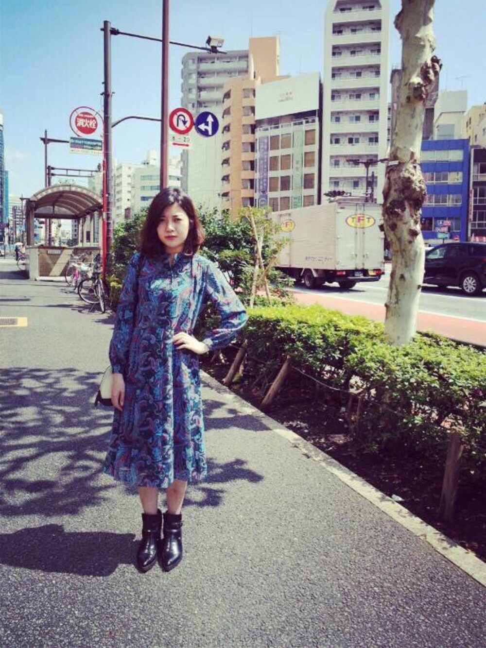 ブルー系のワンピースを着用したレディースの秋コーディネートの1枚目の写真