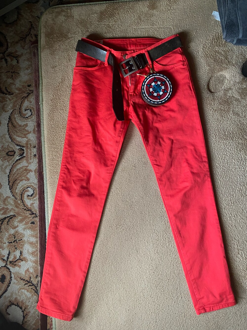 初!赤いパンツ ライダースに合わせたい ただ少しきつい😓 ブラックミーンズの小銭入れをトッピングしてみました