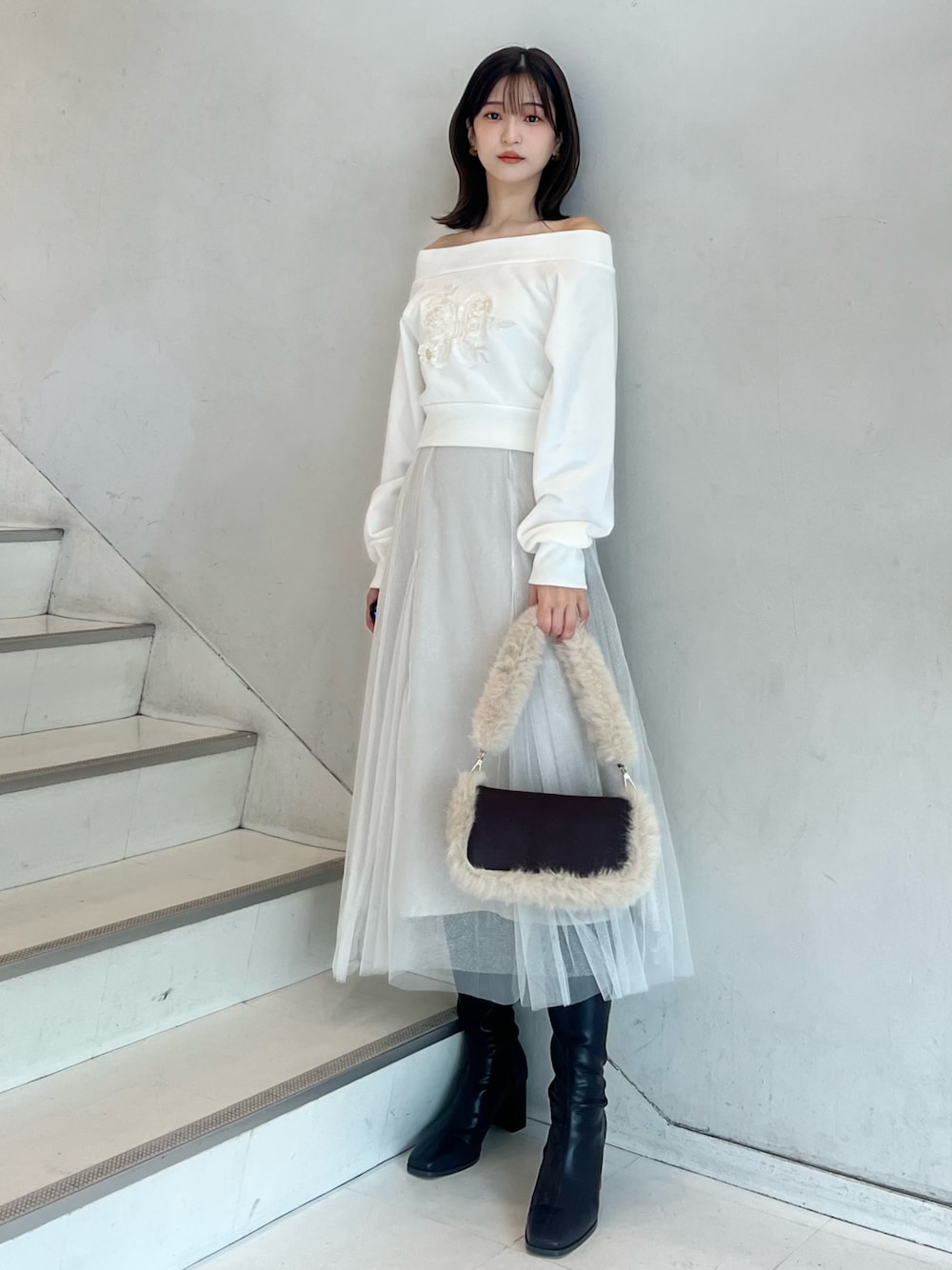miho(MERCURYDUO)のショルダーバッグ「2WAYファーバッグ トリミングショルダー」を使ったコーディネート