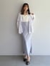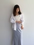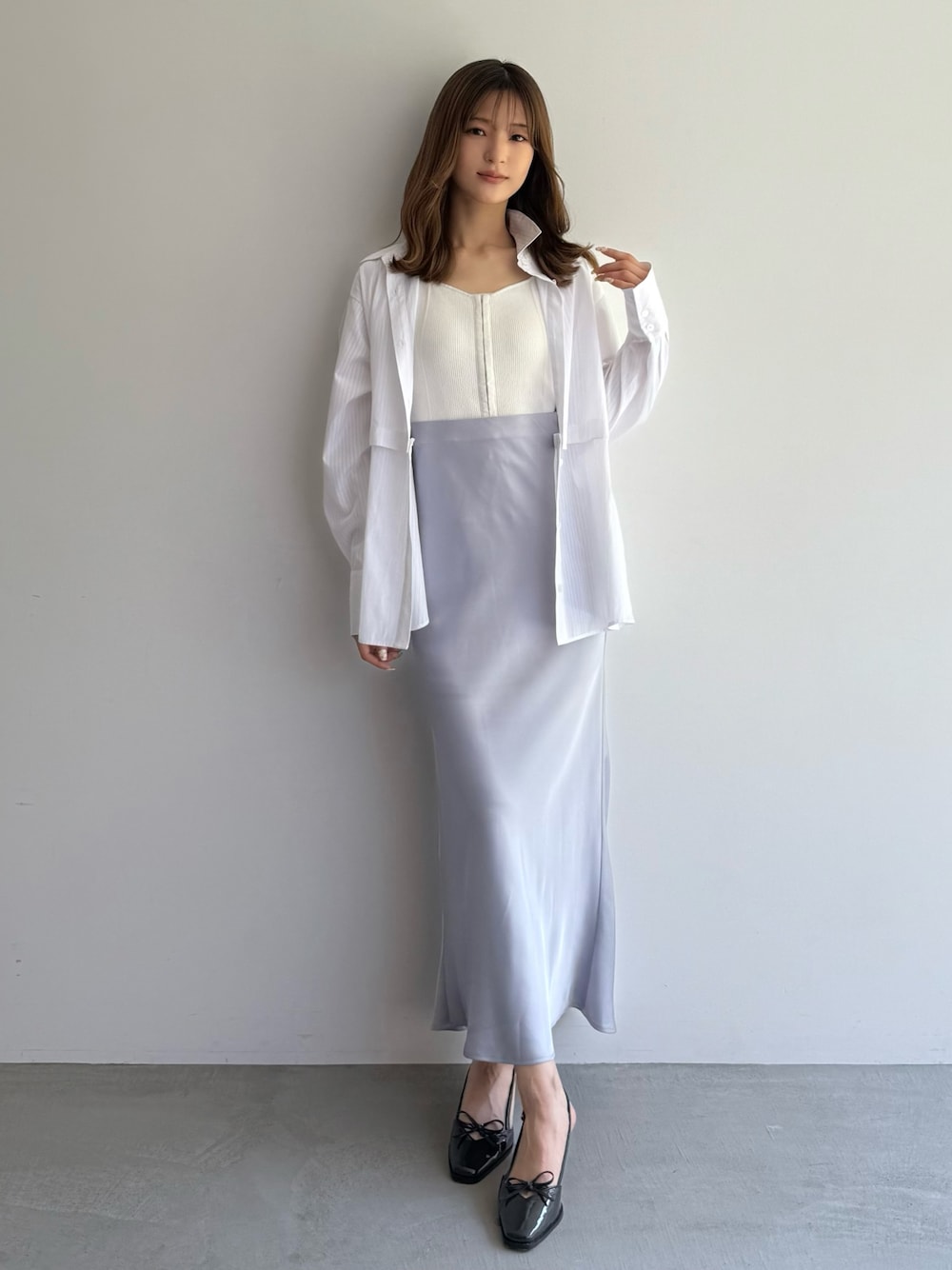 ▷ シャツ ふわっと羽織れる涼しげなストライプシャツ。抜け感のあるシルエットで、こなれたレイヤードに。 着回しポイント: ボタンを閉めて1枚着としても◎。デニム合わせでカジュアルにも、ワンピに羽織っても好相性。 ⸻ ▷ トップス コンパクトなシルエットにフロントのボタンがアクセント。上品さと程よいカジュアル感を両立する1枚。 着回しポイント: ジャケットのインナーやキャミワンピの下にも仕込める万能アイテム。 ⸻ ▷ スカート 光沢感のあるサテンタッチ素材が魅力のナローシルエットのスカート。歩くたびに揺れる、女っぽシルエットが魅力。 着回しポイント: Tシャツ合わせでカジュアルダウン、ブラウスと合わせれば一気にお仕事モードにも。 ⸻ ▷ ミュール リボンディテールがフェミニンなアクセントに。シンプルコーデに映える、程よく甘い万能ミュール。 着回しポイント: デニムやワンピとも相性◎。素足で履いても、ソックス合わせで季節を問わず楽しめる。