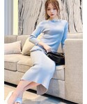 一気に春モードが上がるブルーのワンピース! 足元もホワイトを合わせれば春モードをさらにアップ♪ タイトなシルエットだけど、首元が詰まっている&ミディ丈なので露出しすぎず大人に着用できます♪