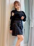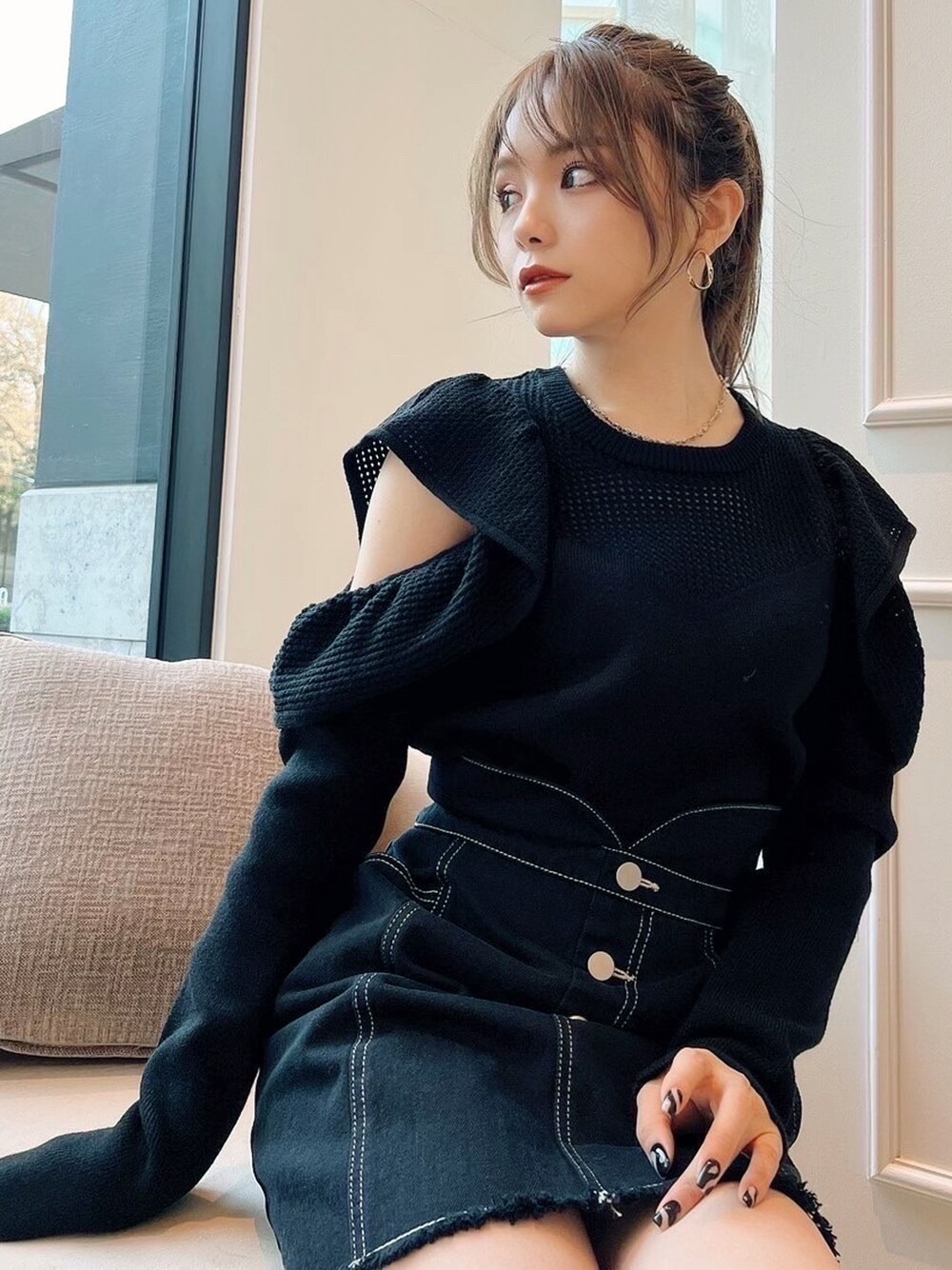 フェミニンなショルダーフリルのトップスに、カジュアルなデニム風スカートを合わせて普段使いしやすいコーデに♪ ブラックでまとめた分ヘアはアップスタイルですっきりまとめるのがおすすめです!