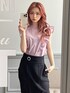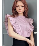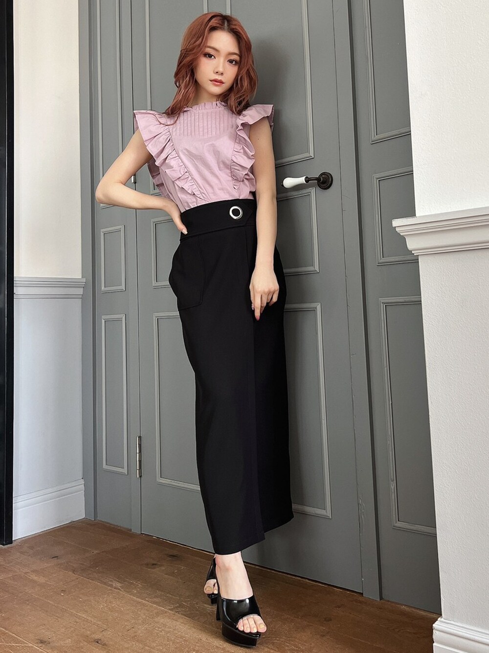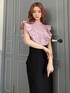ちょっと特別なシーンにもピッタリなコーデ♪ ブラウス×タイトスカートで大人に、だけどトップスのピンクで少し遊び心もプラス。ショルダー部分のラッフルデザインで小顔効果&二の腕の細見え効果も◎