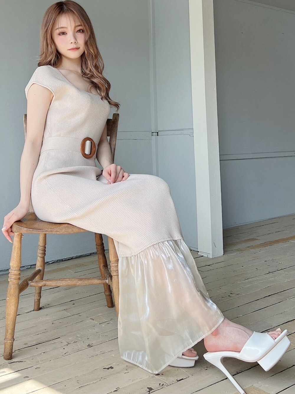 裾のシアー感がシーズンムードをアップさせるワンピースがコーデの主役! シンプルなマーメイドシルエットですが、ウエストのウッドバックル付きのベルトと裾のデザインで普通になりすぎません♪ デートや女子会など、様々なシーンにおすすめのコーディネートです!