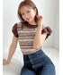 サマーニットトップスをコーデの中心に♪全体的に同系色でまとめれば、柄アイテムもすっきりしたまとまりのあるコーデに!ミニボトムにはボリュームのあるサンダルを合わせてメリハリをプラスすると◎