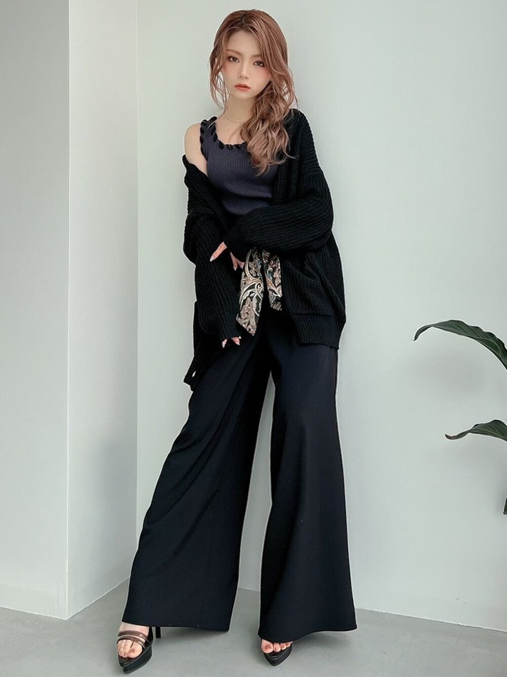 ゆるカーデ×ワイドパンツの大人リラックススタイル! トップスはタイト目・ウエストベルトで腰位置を高く・足元は高めヒールで合わせれば、身長が高くない方でもゆる×ゆるコーデを楽しめます♪