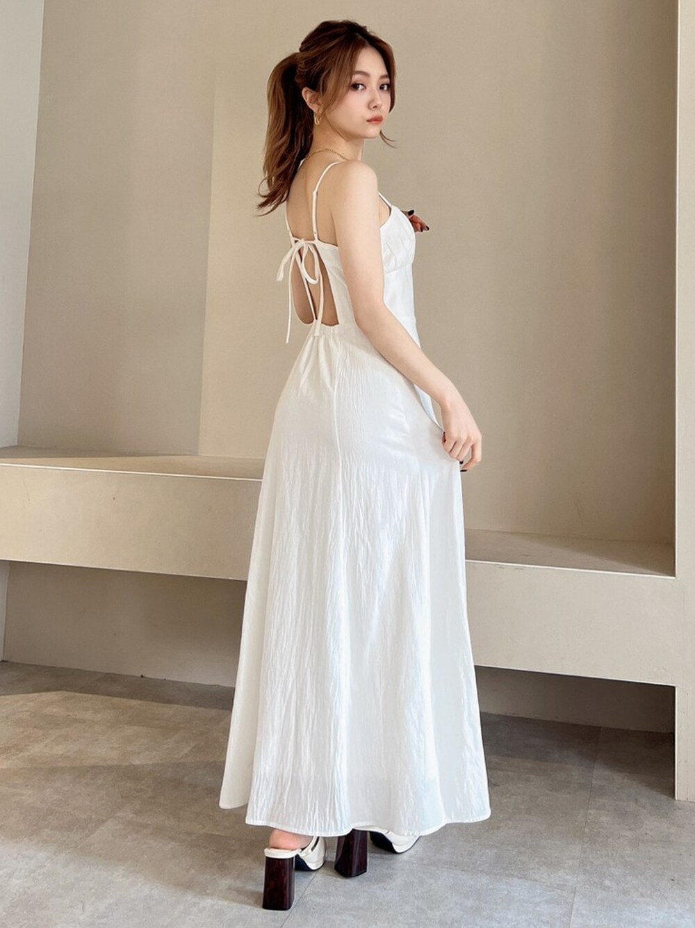 夏にピッタリなホワイトのワンピース! 涼し気な素材感なので、水着の上に着てそのままビーチにお出かけにも◎! アクセサリーをゴールドで合わせて少しヘルシーな印象にまとめました♪