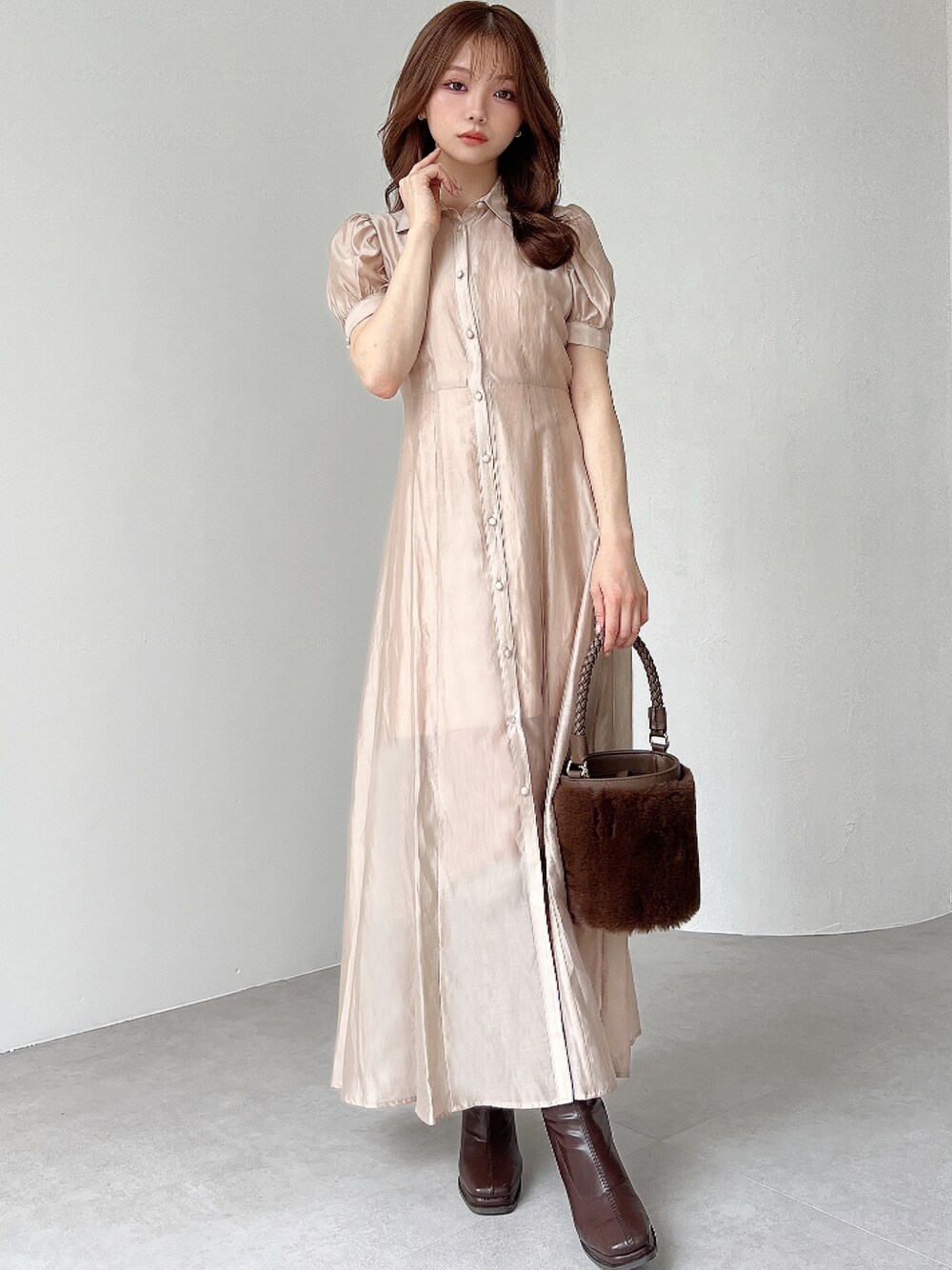 透け素材のワンピースにブーツとファー小物で秋を先取り♪ 首の詰まったデザインが苦手な方でも透け感があると少しすっきり着ていただけます。 ワンピースにはもともとインナーがセットになっているので合わせに困りません!