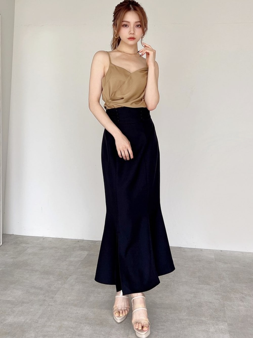 夏コーデだけど、カラーで秋をプラスしてちょっとシーズンを先取り! 露出感がニガテな方でもロング丈ボトムとのコーデならキャミソールも着やすくなります♪ 肌寒くなったらライダースジャケットをプラスするのもおすすめ!!