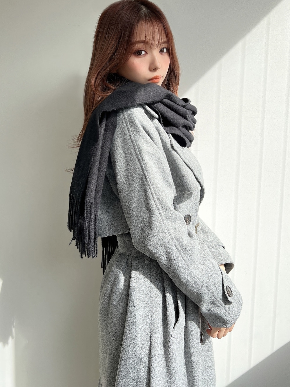 今年GETしたい、グレーのアウター! ブラックのアイテムとの相性が抜群です◎ ストールとロングブーツで防寒対策もバッチリなので、冬のお出かけにおすすめのコーディネートです!