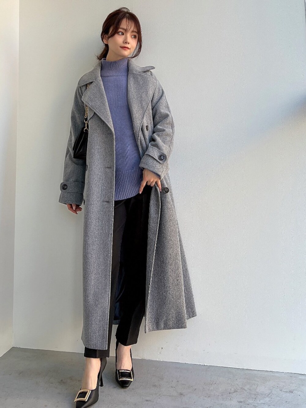 ゆるめニットにテーパードパンツを合わせて通勤もできるコーディネートに! 足の甲を少し肌見せすることで、ロングコート×ロングボトムの合わせでもスッキリ着ていただけます♪