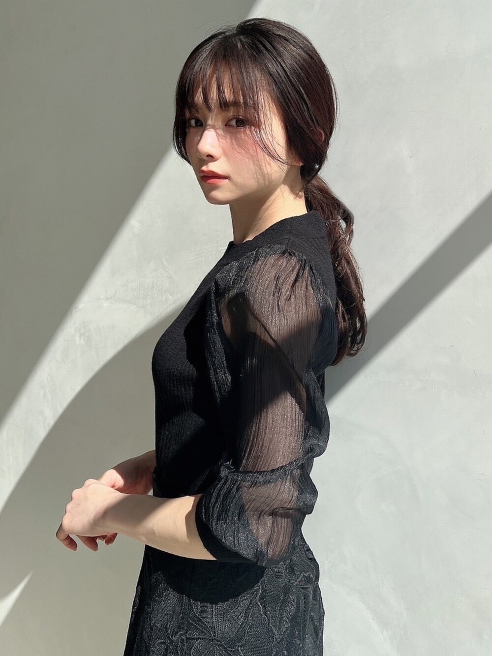 トップスにシアー感のあるアイテムを選んで、春でも重たくなりすぎないブラックコーデに✨ 肌寒い時期にはあえてカラーのアウターを合わせて、春気分をUP♪