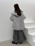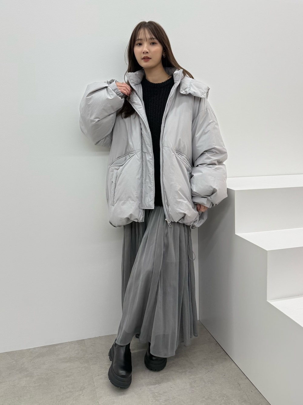 グレーコーデ🩶 ワンピース×ダウンのきれいめカジュアルスタイルに◎ ニットとシアースカートがドッキングされたワンピースは1枚で女性らしく。 ダウンはオーバーサイズのゆったり感が可愛い💭