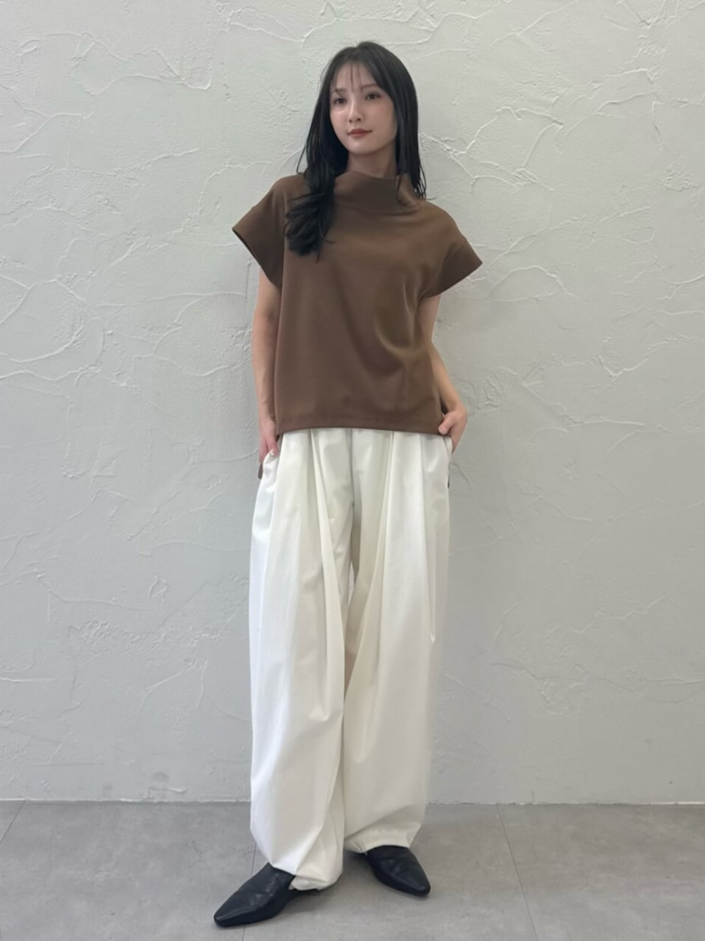 大人らしいとろみ感のある ブラウントップス ホワイトパンツと相性抜群です。 オフィスコーデとしても◎