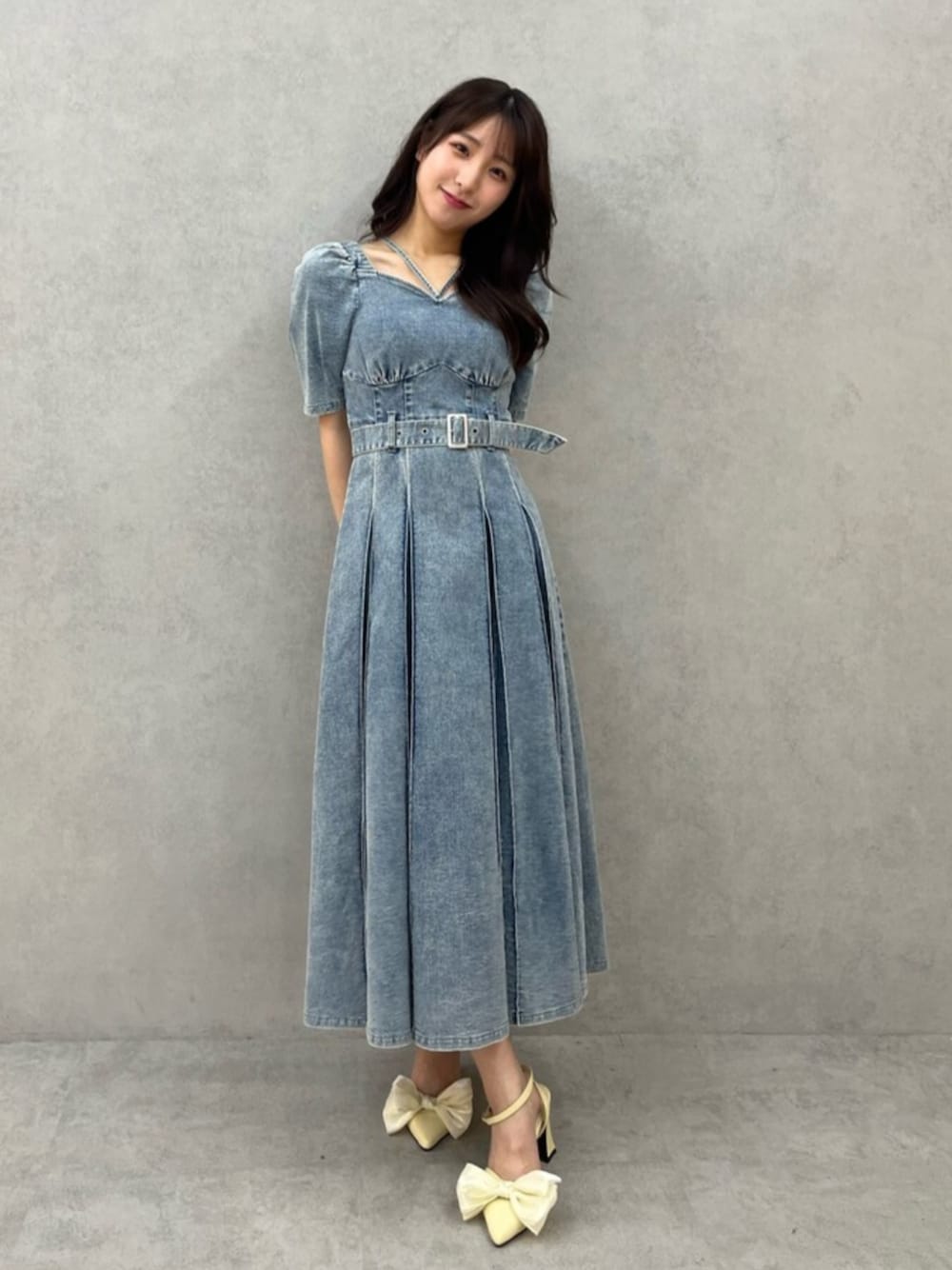 ベルトを絞ることでスタイルも良く見えて、デコルテも見えてスッキリして可愛くて、お気に入りです❤️🔥 リボンのついたシューズがポイント🎀