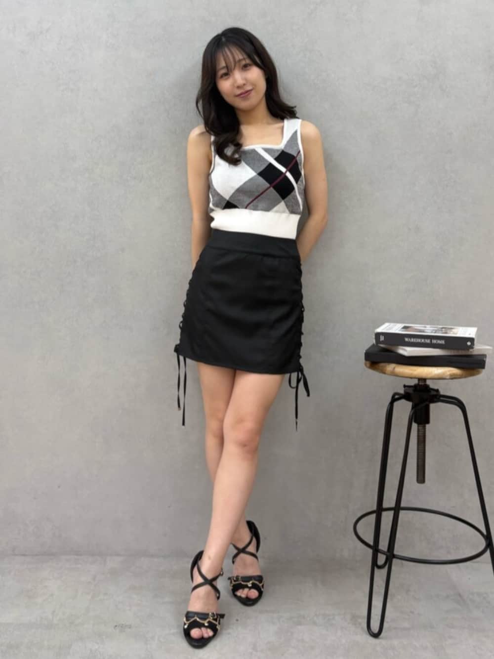 トップスは触り心地のいいサマーニットでデザイン可愛いです🖤 スカートは横で絞り具合を調整できます✨✨ サンダルも装飾がついていてゴージャスでかわいいです🥰