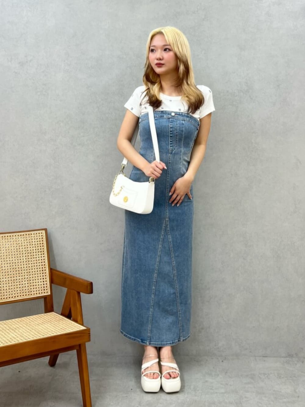 白Tとデニムワンピを合わせた、大人お姉さんコーデ🤍カジュアルでもありつつ、大人っぽい雰囲気も出せる💕カラーもホワイトとブルーだから清楚にまとまります🩵