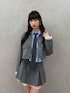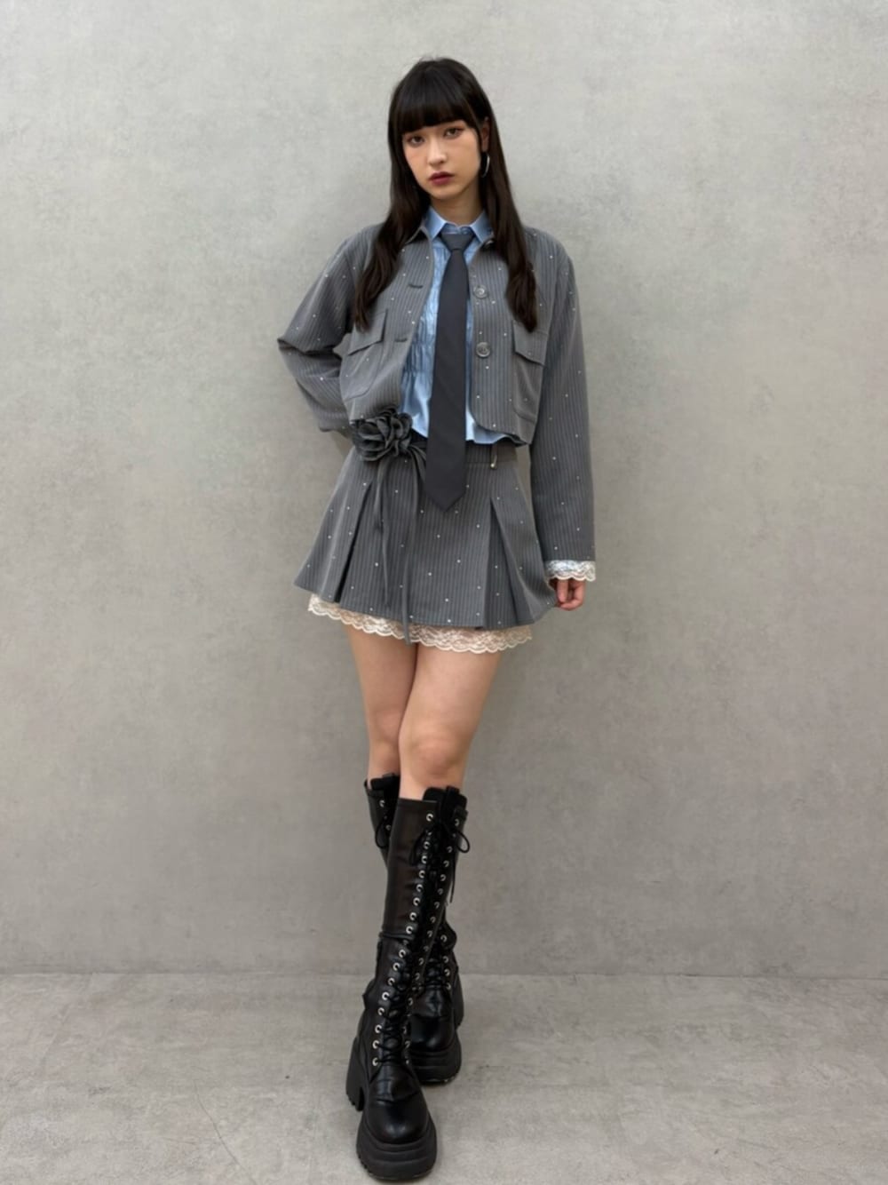 セットアップのテーラードジャケットとスカート、インナーのブラウスにネクタイを締めてクラシカルな印象に! テーラードジャケットとスカートの裾にはレース、全体に散りばめられたラインストーンがきらきらかわいい!上品でガーリーなコーデにしてくれます。 スカートのローズモチーフもjouetieらしいワンポイントです!