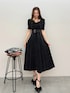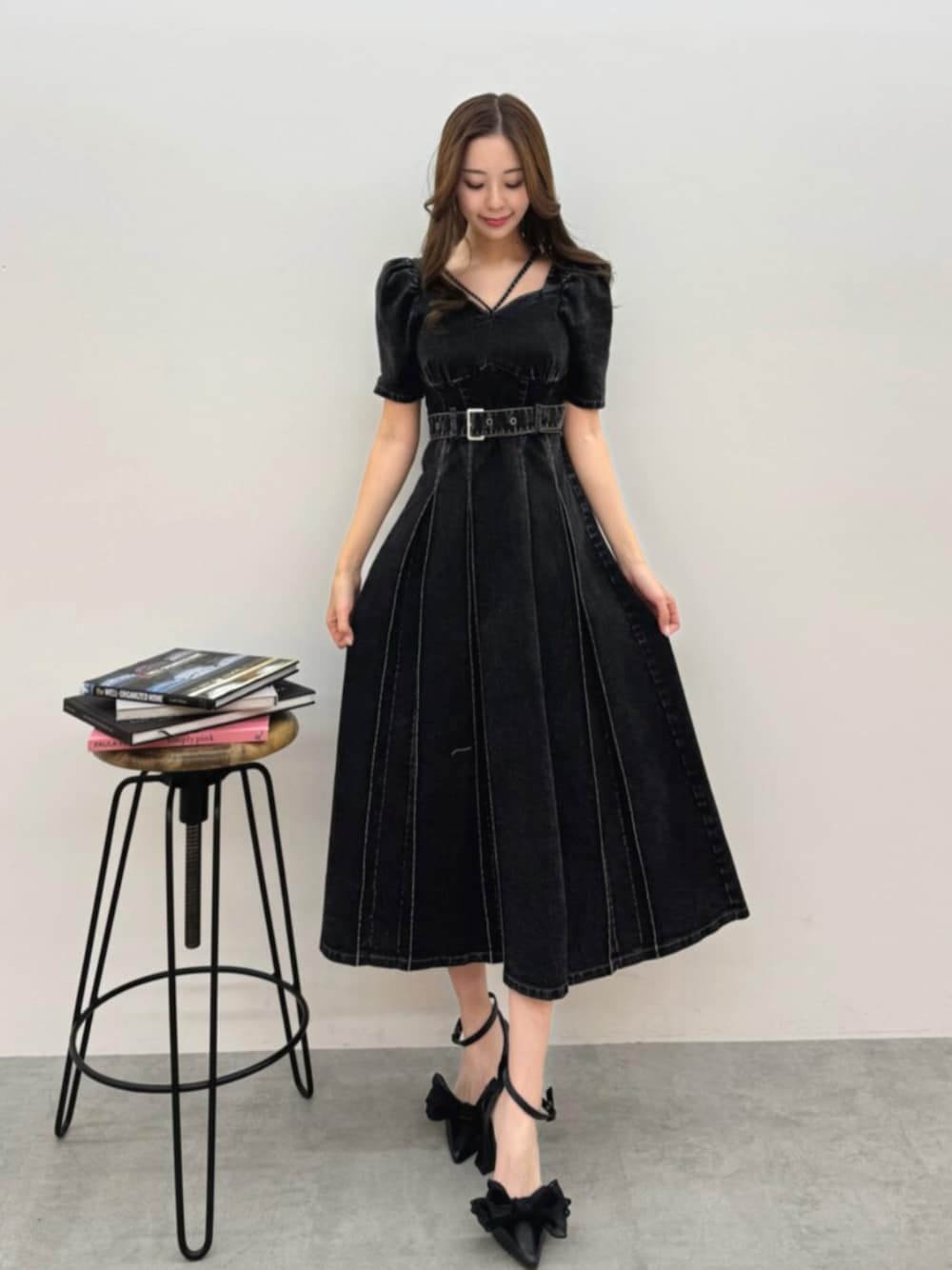 ブラックのデニムワンピース:重厚感のある素材だけど、ウエストマークとフレアシルエットで女性らしいシルエットに🤍🤍 リボン付きのヒール:足元で甘さをプラス。ちょっとした遊び心も✨🎀 レトロガーリーだけど今っぽく、ちょっとモード寄りに仕上げた黒のワントーンコーデです!!
