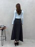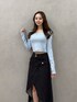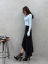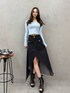 ・ブルーのトップス:春らしい柔らかく爽やかな色味が、全体に抜け感をプラス。軽やかで女性らしい雰囲気を演出🌸 ・アシンメトリーデザインのブラックデニムスカート:足を綺麗に見せてくれるデザインで、ボリュームがありつつも広がりすぎないシルエットがかわいい! ・シースルー素材の厚底ヒール:抜け感と存在感を同時に出せるアイテム。春の気温にちょうどいい、重すぎない足元バランス🖤