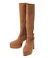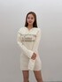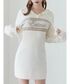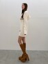 アイボリーのニットワンピースを主役にした秋冬スタイル。 胸元のロゴがポイントになり、シンプルながら存在感のあるデザインです。 ブラウンブーツで全体に統一感を持たせ、やわらかな印象にまとめました。