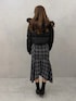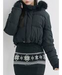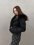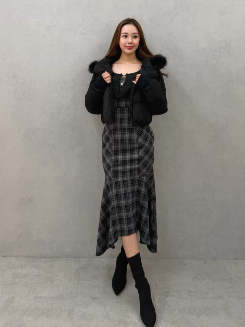 落ち着いたチェック柄のワンピに短めの黒ダウンを合わせて、全体をすっきり見せたコーデ。動きのある丈感で冬でも軽くまとまる。