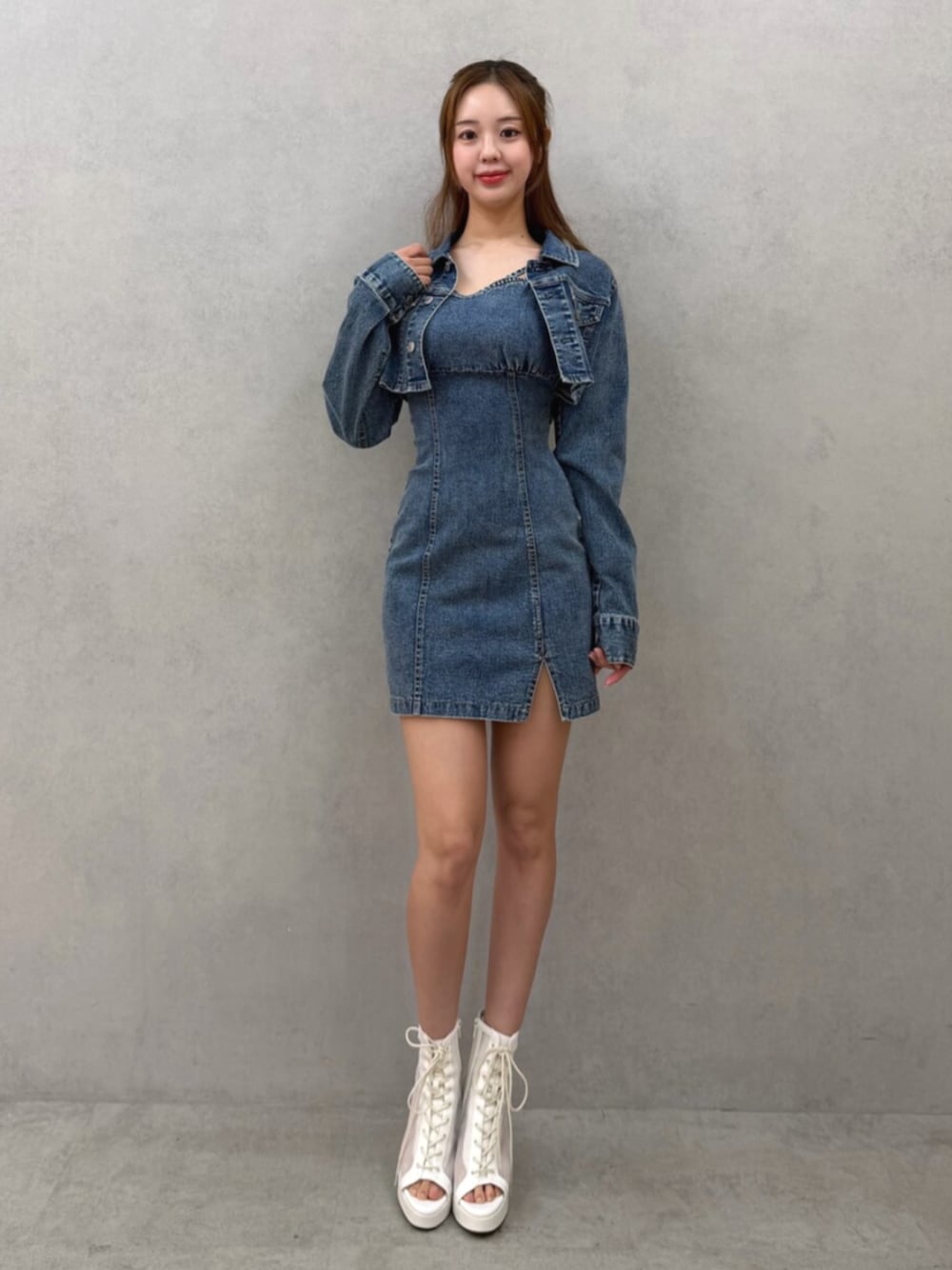 ・デニムワンピースでシンプルだけど存在感のあるスタイルに👗💙 ・コンパクトなシルエットでウエストラインをきれいに見せてスタイルアップ✨ ・フロントスリットがさりげない抜け感をプラス💫 ・ホワイトブーツを合わせて、重くなりすぎないバランスに🤍 カジュアルだけど女性らしいシルエットで、 デートやお出かけにもぴったりなコーデです🌿