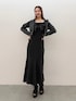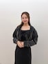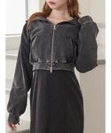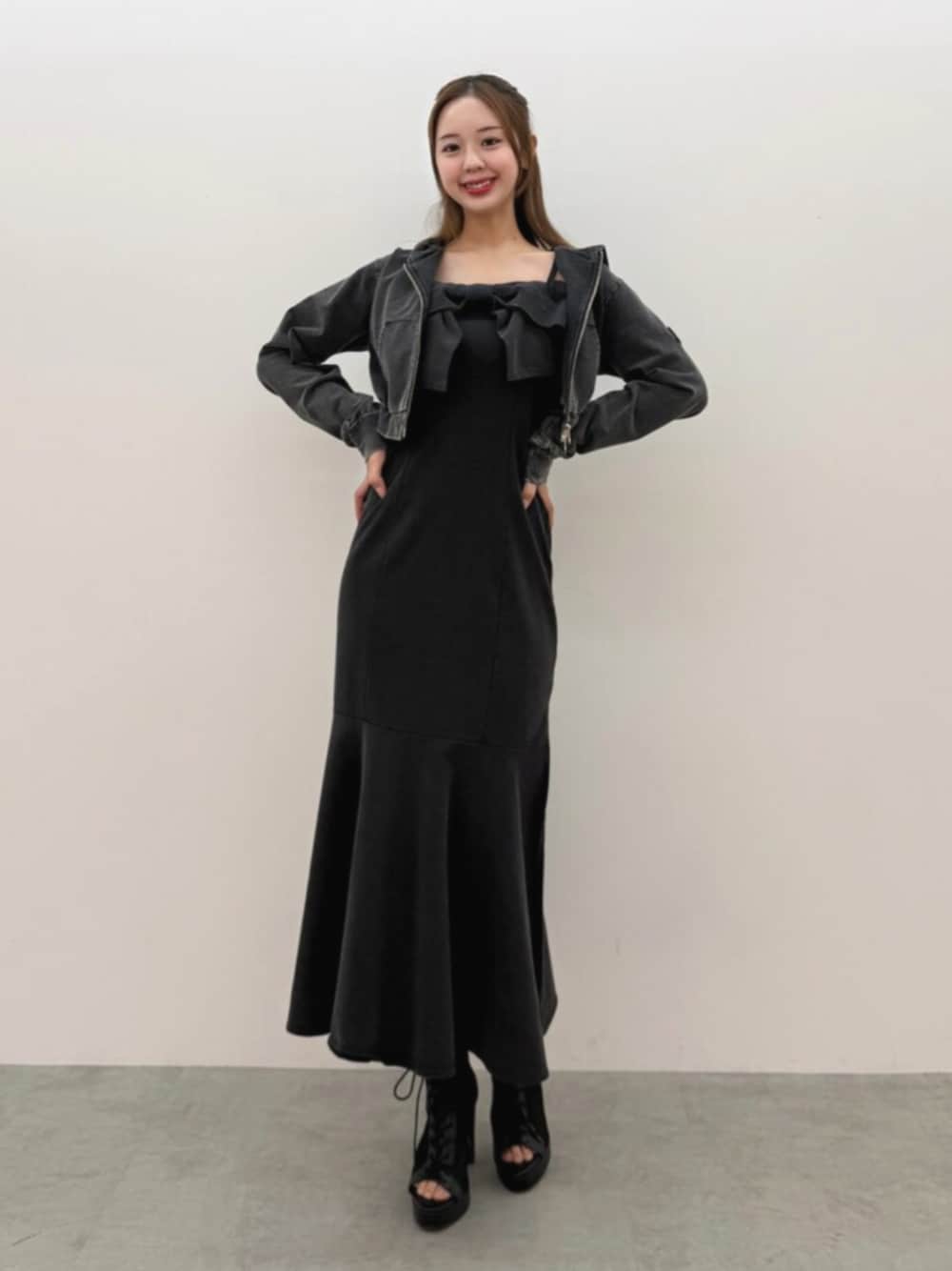 リボンデザインのブラックワンピースを主役にしたコーデ。 甘くなりすぎないようにショート丈のパーカーを合わせて、全体をすっきり大人っぽくまとめました。 足元は厚底サンダルでスタイルアップしつつ、ワンピースのシルエットがきれいに見えるバランスに。 シンプルなモノトーンで、上品さと可愛さを両立したコーデです。