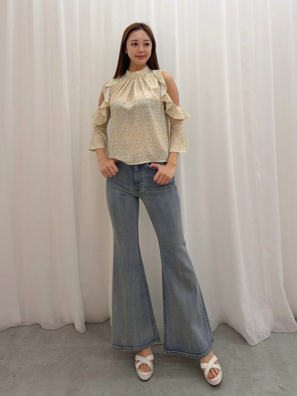 ふんわりトップスで春っぽく🌼 EATMEのブラウス 肩あきデザインとフリルで 甘さをプラスしつつ、 デニム合わせで程よくカジュアルに◎ 頑張りすぎない大人可愛いコーデ🫶