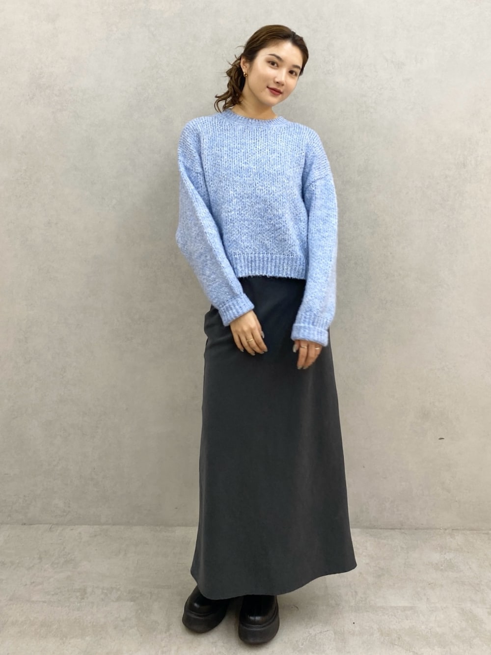 水色を差し色にした甘め×カジュアルコーデ。デートや女子会などにぴったり! 今回はブーツしてみましたがヒールやスニーカーと合わせても◎👠 【POINT】 ・丈が短めのニット →細身のパンツスカートと合わせると 脚長&縦ラインを強調できます。 まだ腕部分は太めのシルエットなので 動かしやすいのもポイントです! ・着回し抜群の形はシンプルスカート →形に癖がないのでカジュアル〜綺麗め まで幅広く対応できます 薄手の柔らかい素材のスウェード生地は スカートに動きが出て、 重たくなりません。 ・淡めカラーで優しい印象に 【こんな人におすすめ】 ・色物にチャレンジしたい人 ・綺麗めコーデが好きな人 ・カジュアル好きだけどチャレンジしたい人