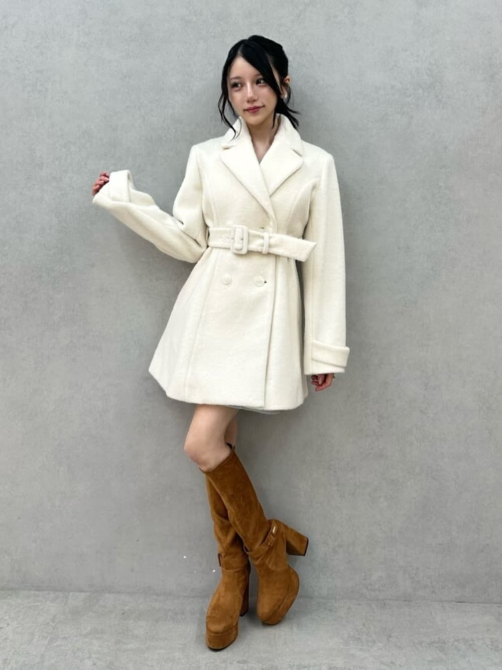 Winter デートコーデ ♡羽織るだけで主役アイテムの柔らかい素材のコート ♡ウエストマークのベルト付きで細見え効果! ♡ブーツはあえてのブラウン系でかわいくまとめました