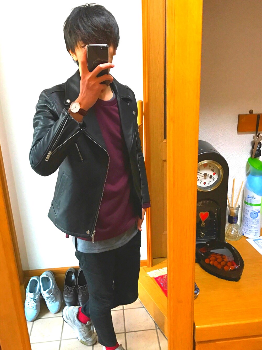 黒×赤 今お気に入りのHAREのダブルライダース インナーは赤で合わせてみました 全体的にシンプルで押さえてみました サイズ詳細 ライダース M インナー M パンツ S 靴 27.5㎝