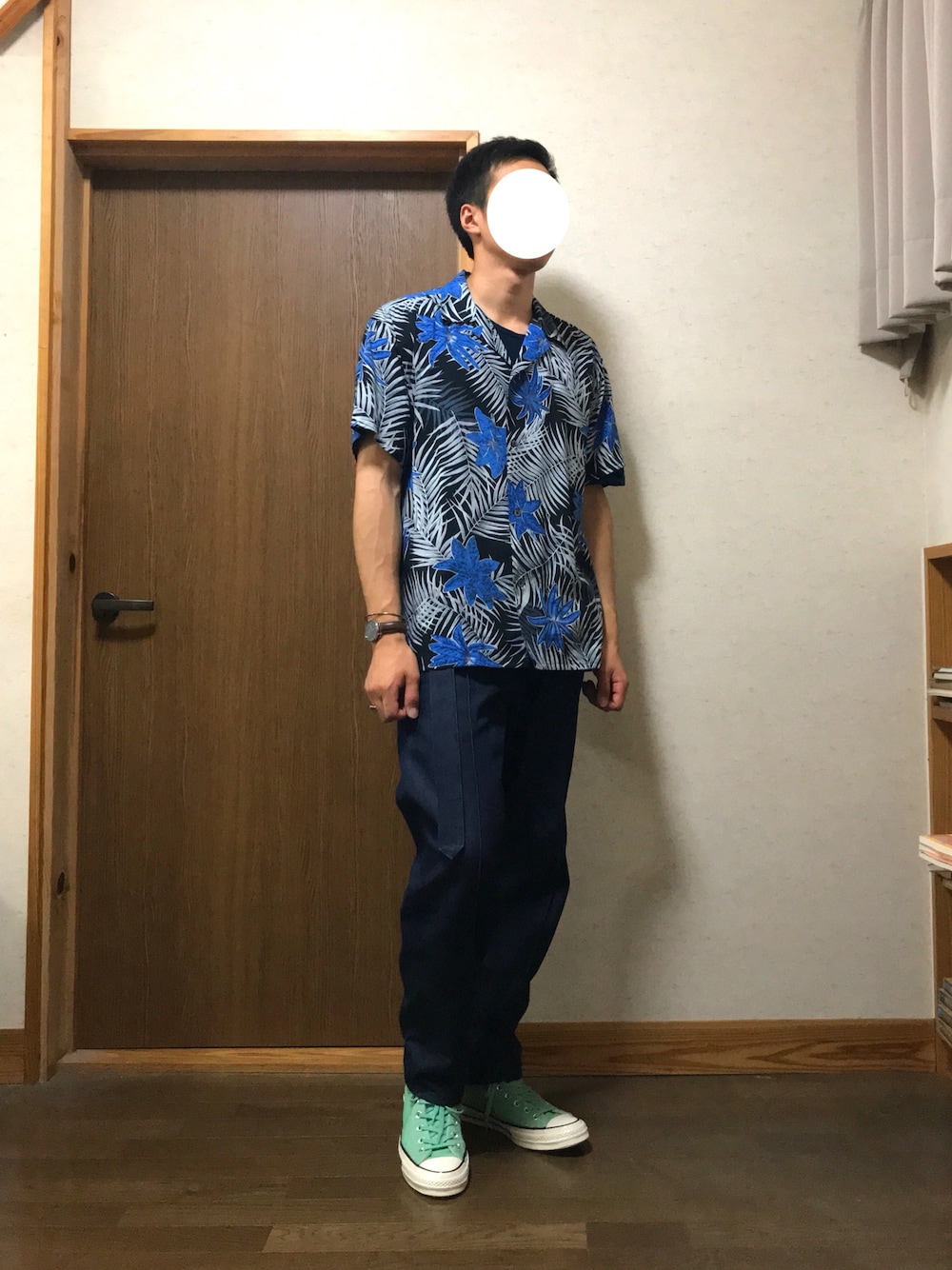 こんにちは😃 今回は柄シャツコーデ!! カジュアルな感じにしてみました👌 コンバースの色は可愛くてお気に入り💕