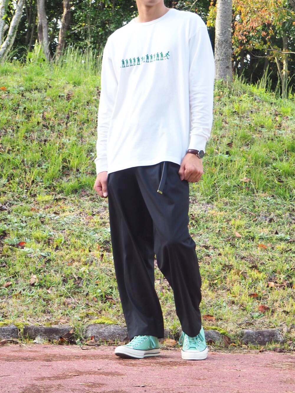 こんにちは😃 今回はロンTコーデ! 胸のプリントの緑と靴の緑を合わせてみました👍
