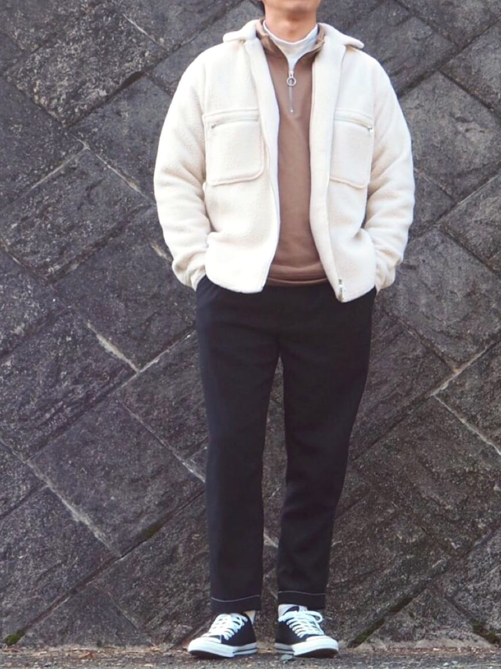 今回はボアジャケットコーデ!! リングジップを使ってトレンドを意識! ボアはコンバースと相性がいいですね👍