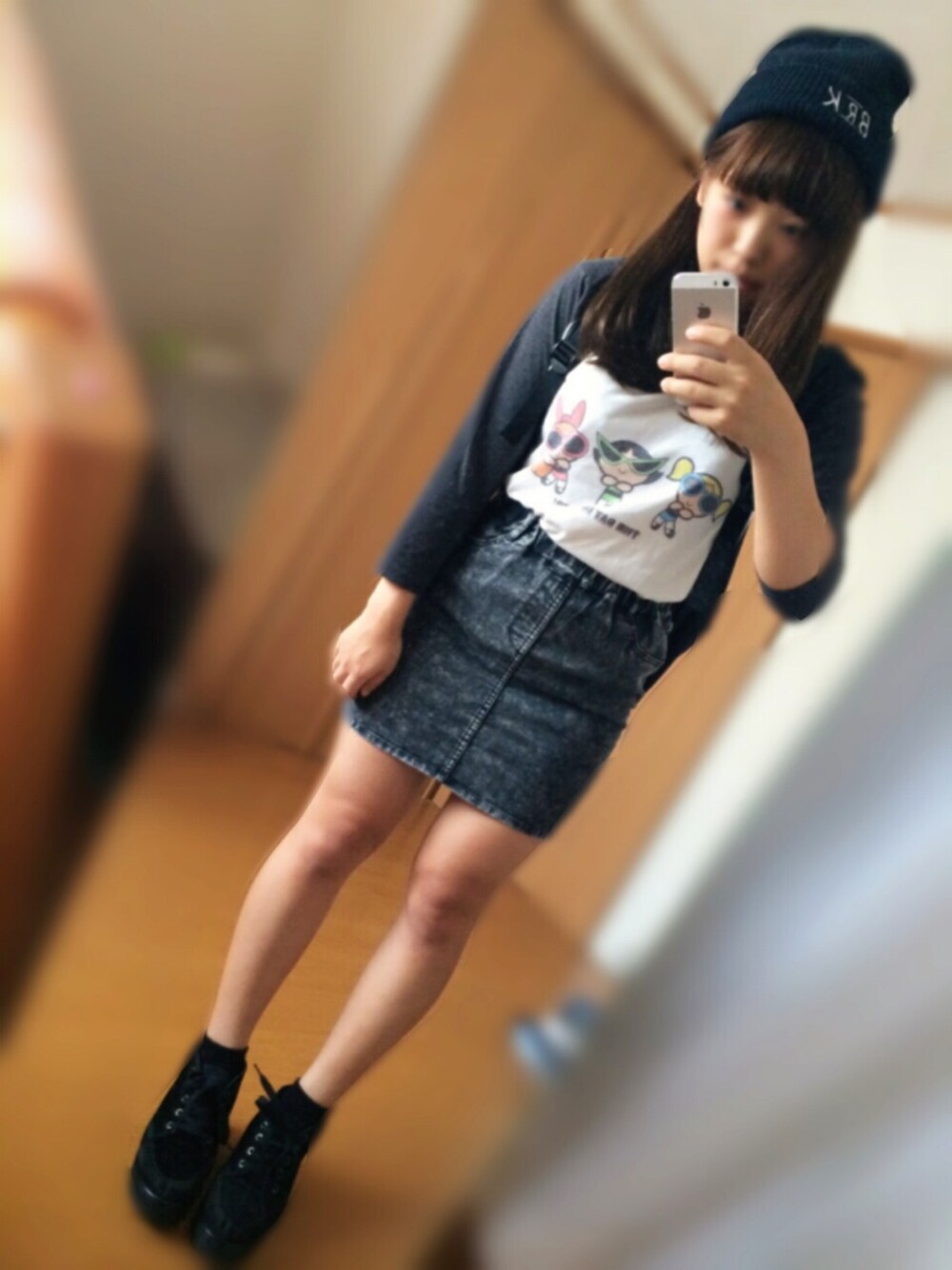 ラグランも靴下もだいすきなパワーパフガールズ♡ ラグラン:merry jenny スカート:JEANASiS シューズ:JEANASiS ニット帽:HARE リュック:adidas