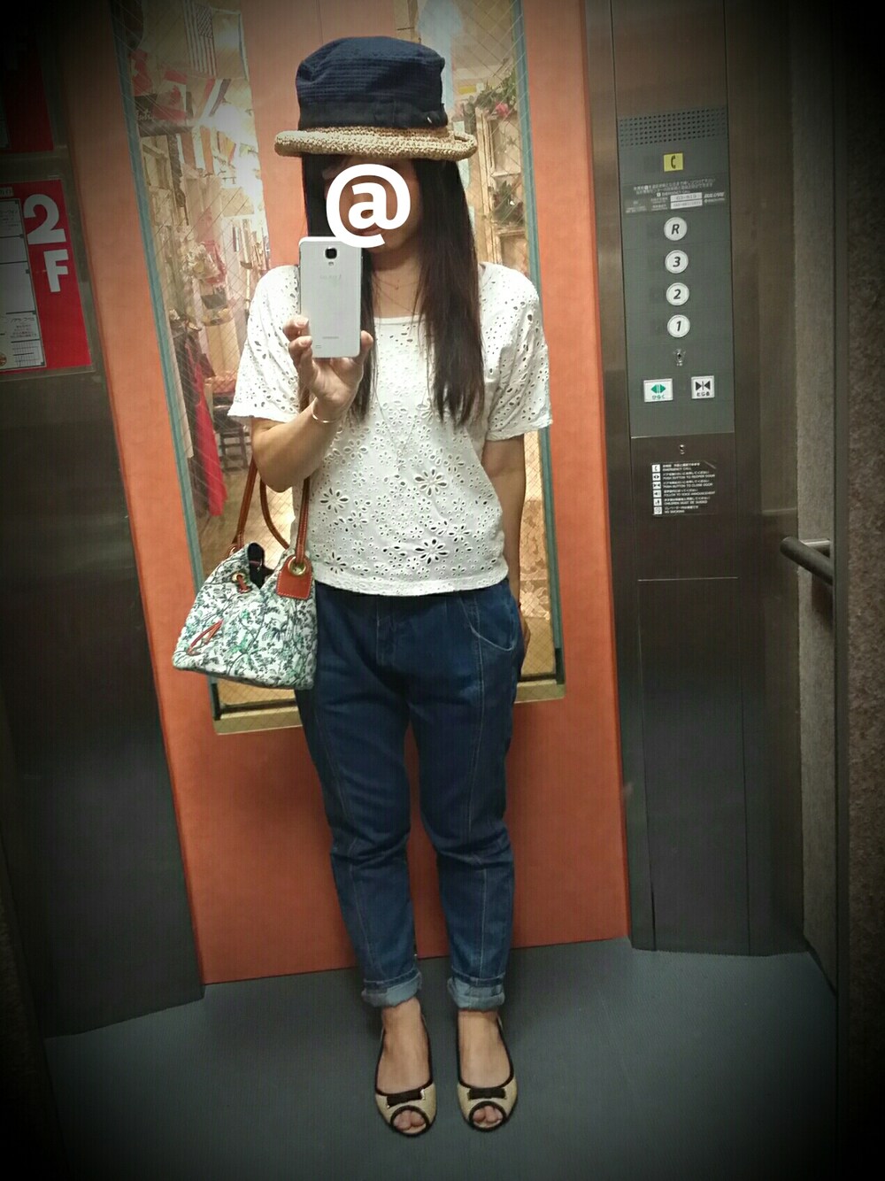 異素材のハットも 変なライン入りのデニムも コットンレースのトップスも おNewの黒リボンのサンダルも ボタニカル柄ポシェットもお気に入り!