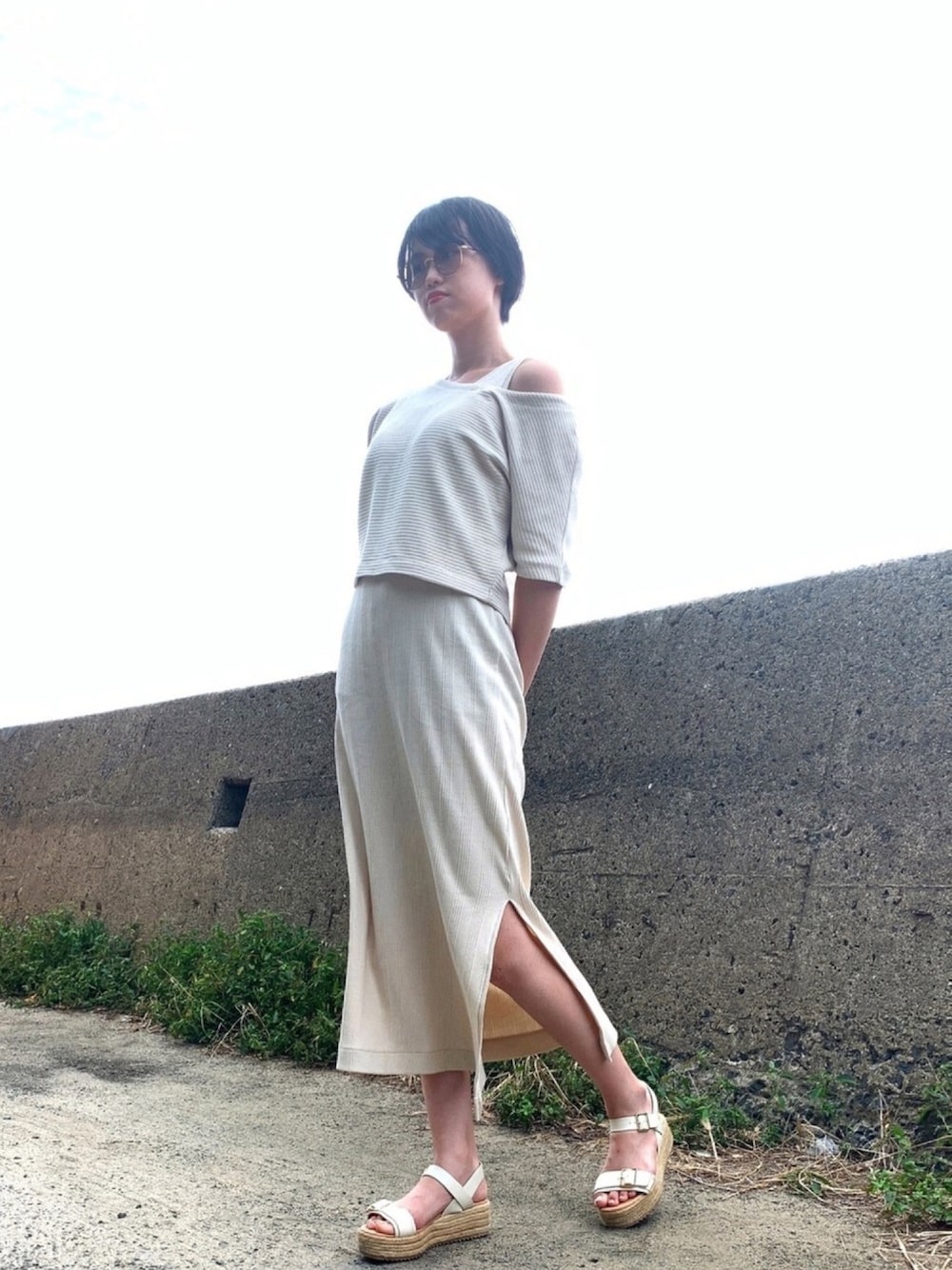 夏のオールホワイトコーデ!! Iラインを意識したコーデになっていて、さりげない肩出しやスリットで肌見せしています。 夏の強い日差しにはサングラスで対応! コーデのワンポイントにも! デートにもおすすめです!