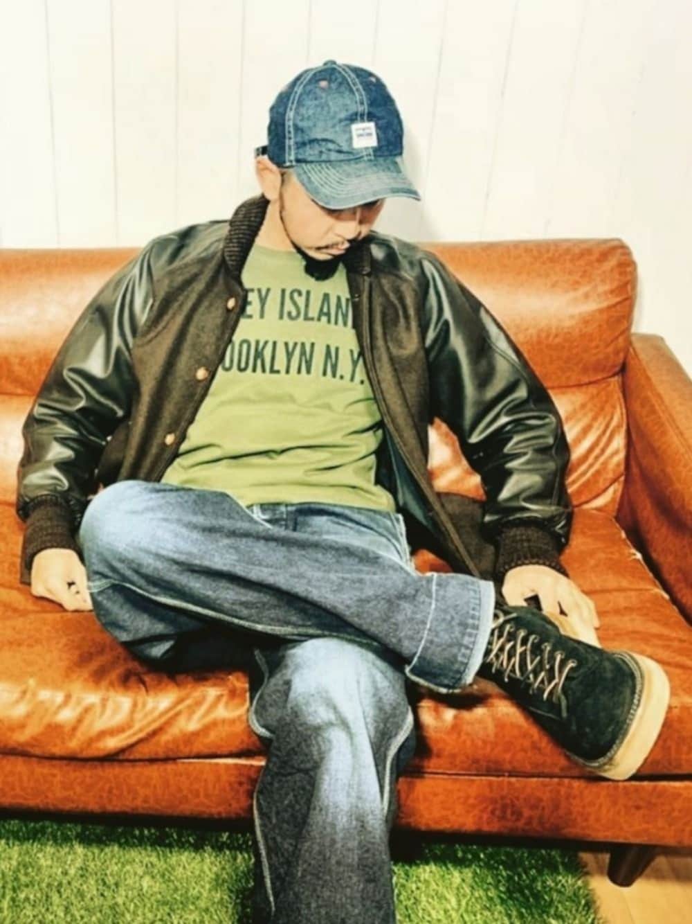 M's FLAGS coordinate キャップはoilco、アウターはスクーカムのスタジアムジャケット。インナーはオリジナルのM's FLAGSです。 デニムパンツはラルフローレン、ブーツは存在感のあるホワイツを合わせました。 M'sFLAGSアメカジです🇺🇸🗽