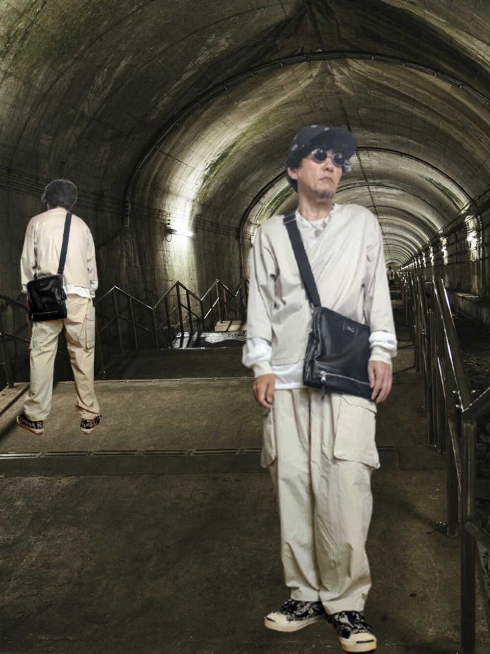 #スクエアバッグ の艶のある革の黒をアクセントに使ったベージュxブラックコーデです。トップスは1枚でレイヤード構造になっているカットソーです。 最近はナイロン系のワイドなパンツが調子いいです。黒とグレーと白は持っていたのですが、ベージュが欲しくて探していたところZozoで見つけました。Wild Thingというブランドです。