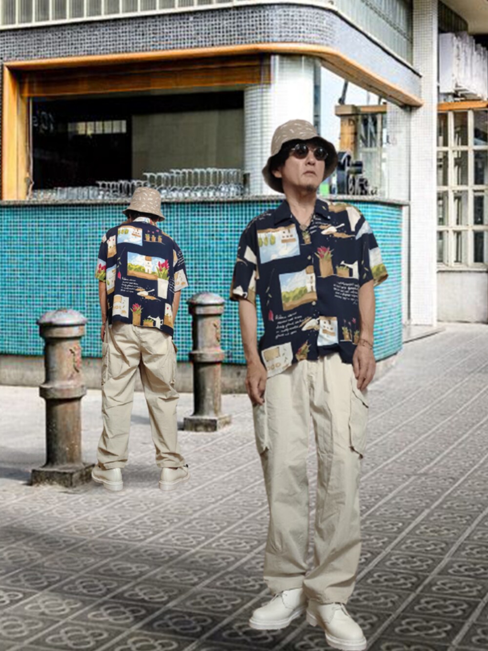 #バケットハット を使ったレーヨンシャツコーデです。ベージュxネイビーにシャツの柄がアクセントになっています。靴は抜けた軽さを出すため白靴としました。パンツとハットはWEAR主催者ZOZOで買ったものです。たまにはお世話にならないといけません。