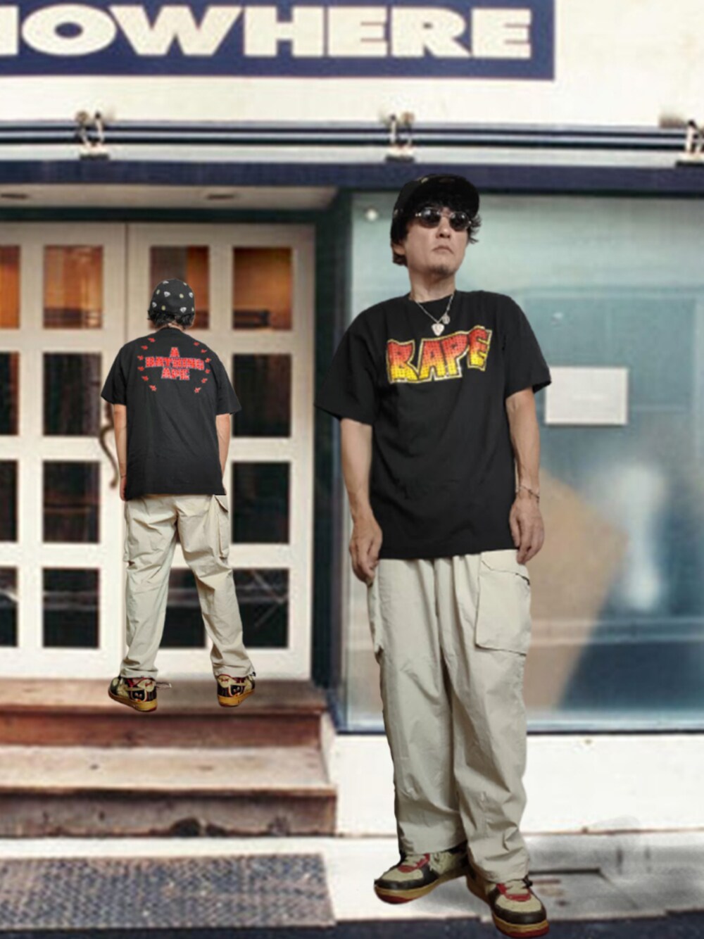 #ロゴT を使った裏原ストリートコーデです。1993年にタイムスリップしてNOWHERE前での撮影となります。いつ行っても商品が一つも置いてない伝説のショップです。転売屋が店の前にまさに住んでいました。