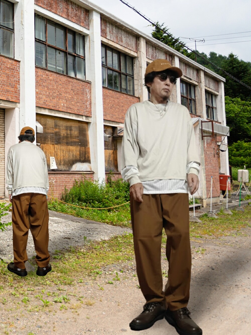 レイヤード風の切り替えしロンTを使ったブラウン×ベージュコーデです。