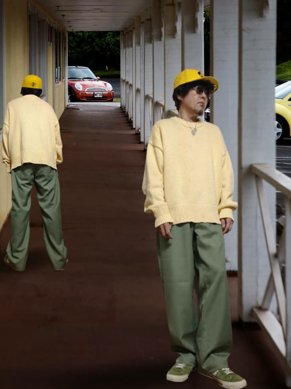 オフホワイトでもなくアイボリーでもなくクリームでもない黄色っぽい色がお気に入りのミドルゲージニットとグリーンのスラックスを使ったイエロー×グリーンコーデです。自分ではこのニットの色とたまご色とかミルクセーキ色と呼んでいます。上下でバキッと二色分けました。