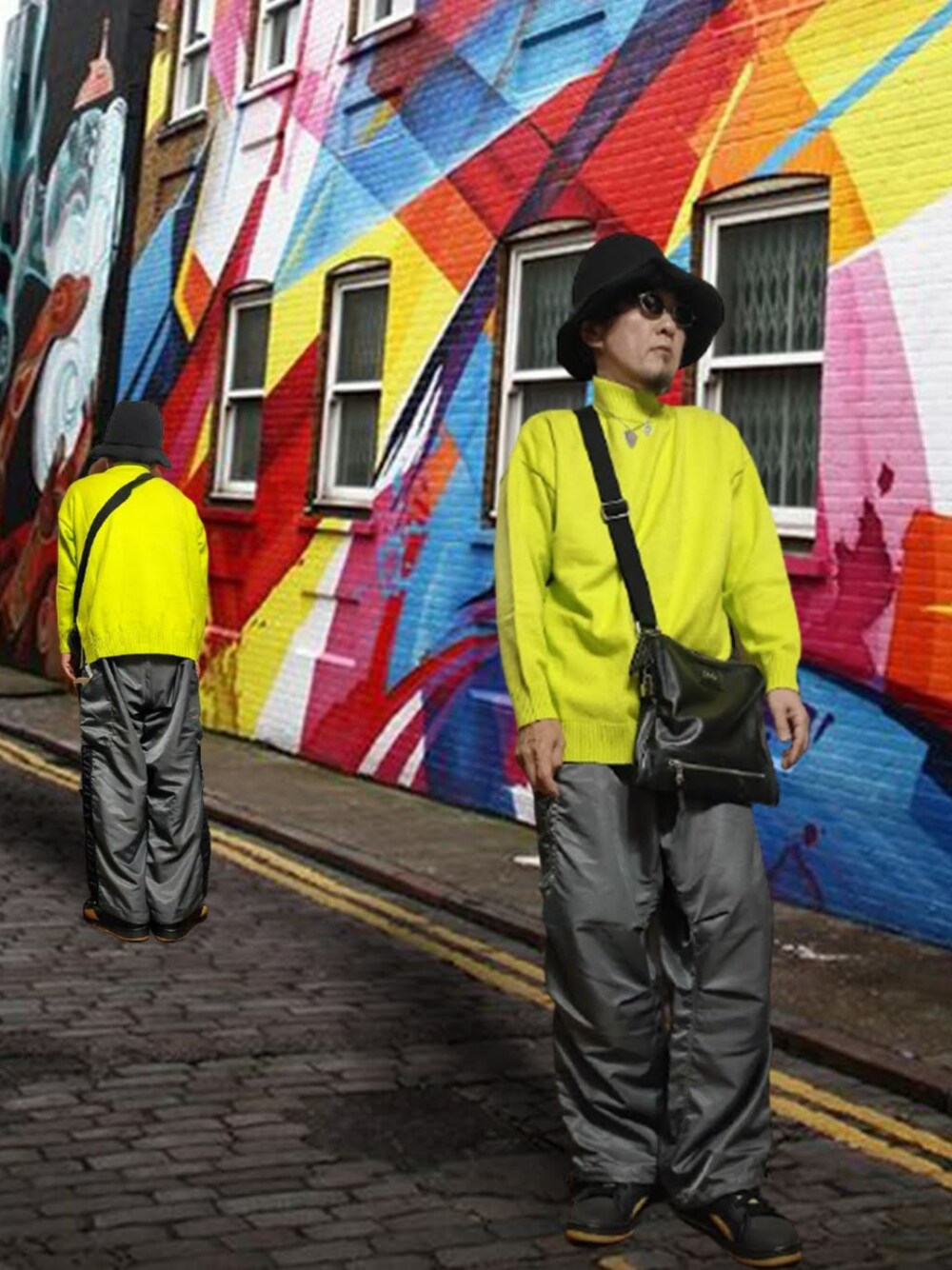 かなり強烈なネオンイエローと黒レザーのバッグを使ったコーデです。インナーで刺し色用にと買ったニットなのですが、まずはメインで使ってみました。