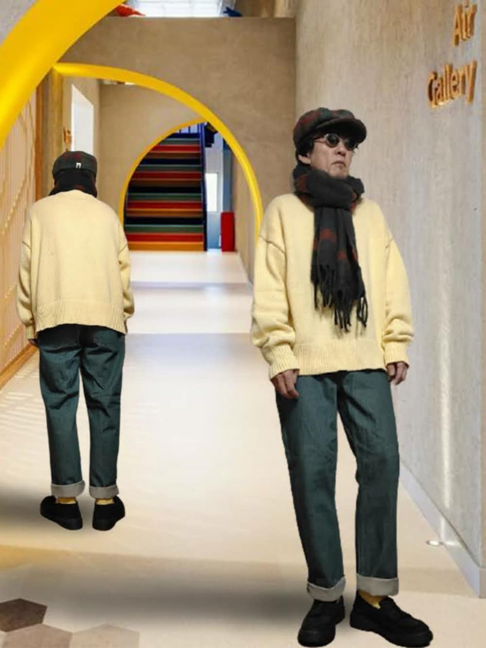 UNIQLOJWアンダーソン2020AWのマフラーとエイプのラブジェネチェックグリーンが柄、色味ともそっくりだったので合わせてみました。お揃いですね。またニットと靴下も大好きな卵イエローで揃えてみました。そして靴下を見せるためローファーにしました。