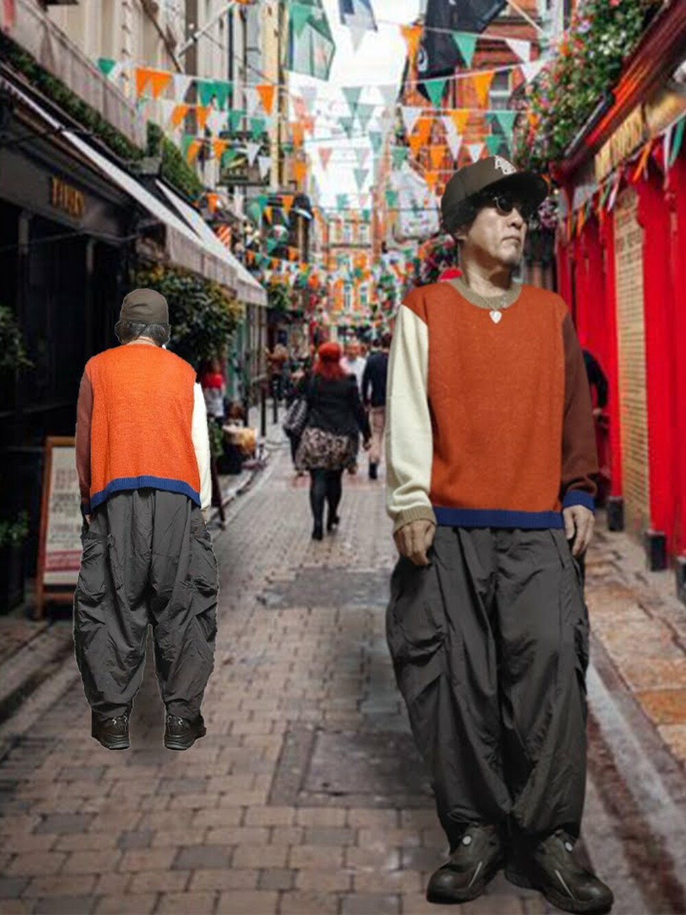 ユニクロINESのクレージーカラーニットにGOOPiMadeのカーゴパンツを合わせました。このニットはたいへんブラウンと相性がいいです。