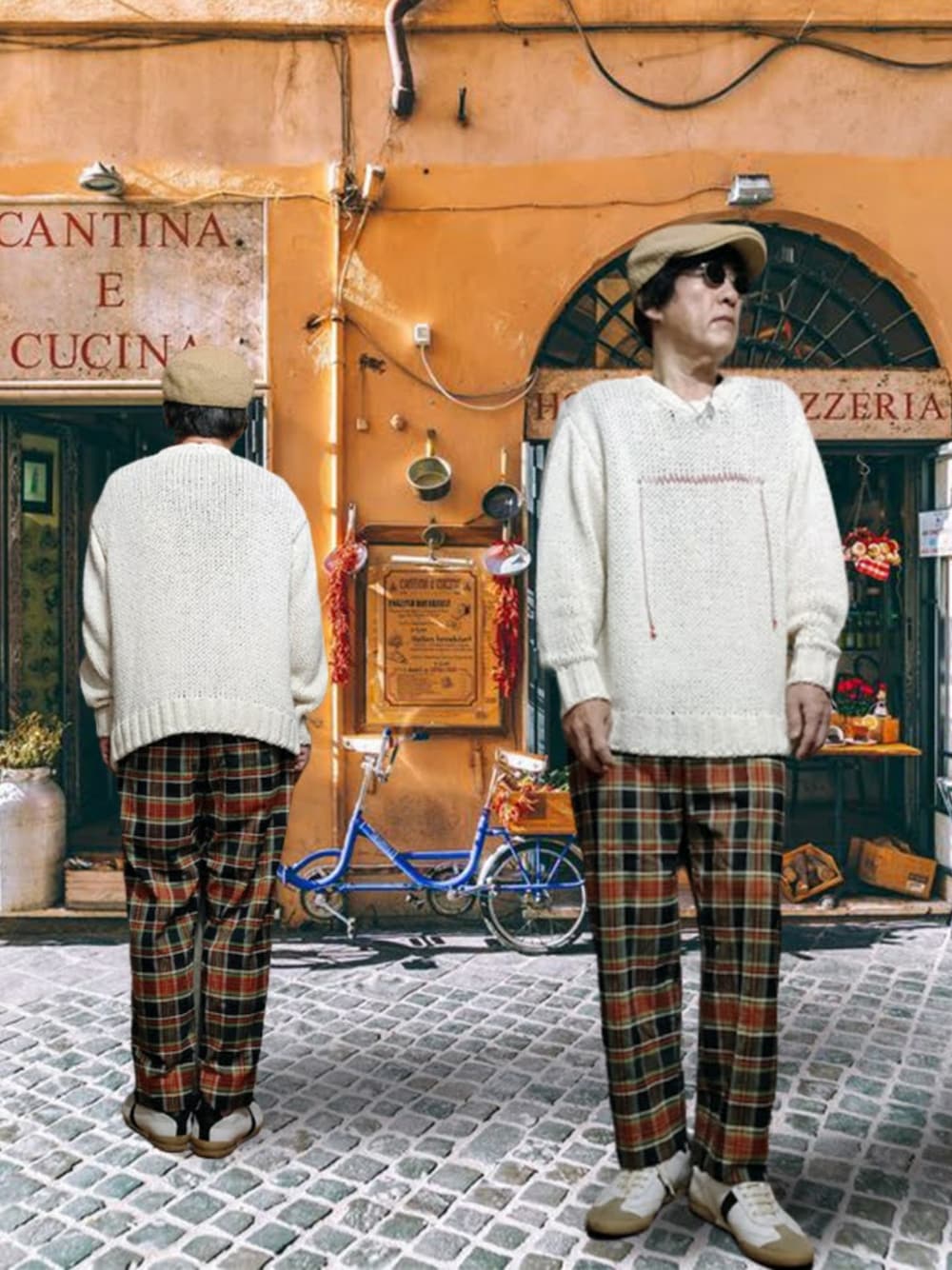 2023GUxBeautiful PeopleのマドラスチェックパンツとNEONSIGNのニットを合わせたコーデです。ニットのフロントのしれっとした赤いラインとチェック柄の赤色の部分の色味を合わせてみました。